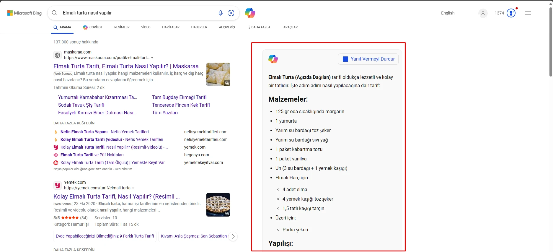 Aramalarınızda sağda çıkan Copilot sayesinde hızlıca isteklerinize ulaşabiliyorsunuz. Bunun için ekstra bir emek sarfetmenize gerek olmaması da harika. Çok güçlü bir yapay zeka olduğu için kaliteli cevaplar veriyor ve sorularınızı hızlıca cevaplıyor. Tabii her arama motorunda olduğu gibi görsel araması da mevcut ve diğer tür aramalar da yapabiliyorsunuz.